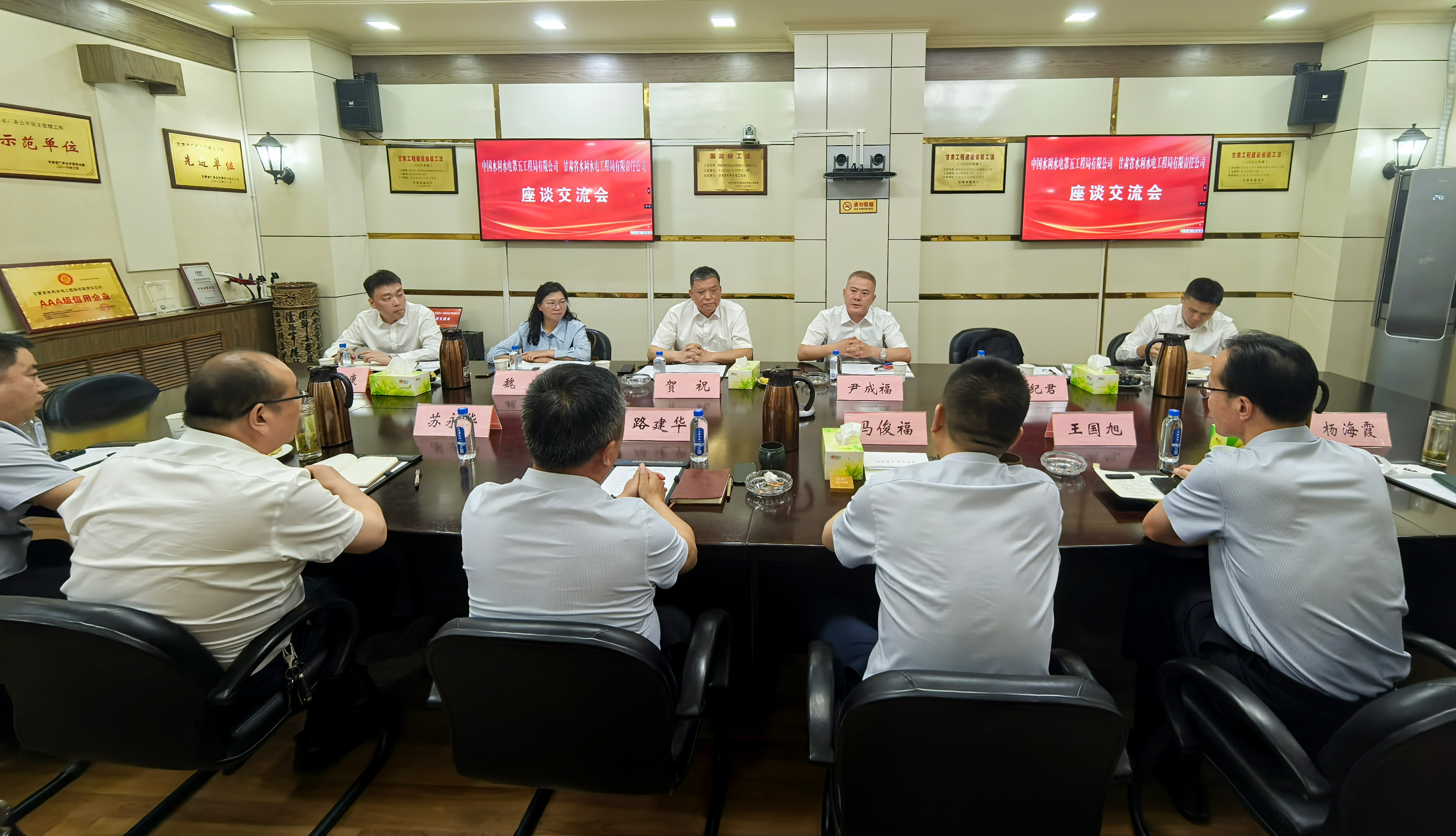 5月20日,公司黨委委員、副總經(jīng)理賀祝一行到甘肅省水電工程局公司參加合作交流座談會。甘肅省水電工程局公司黨委書記、董事長馬俊福,黨委副書記、總經(jīng)理、董事路建華等出席會議。雙方圍繞深化甘青寧區(qū)域水利能源項目合作、推動資源共享、實現(xiàn)央地國企協(xié)同發(fā)展等議題展開深入交流。
