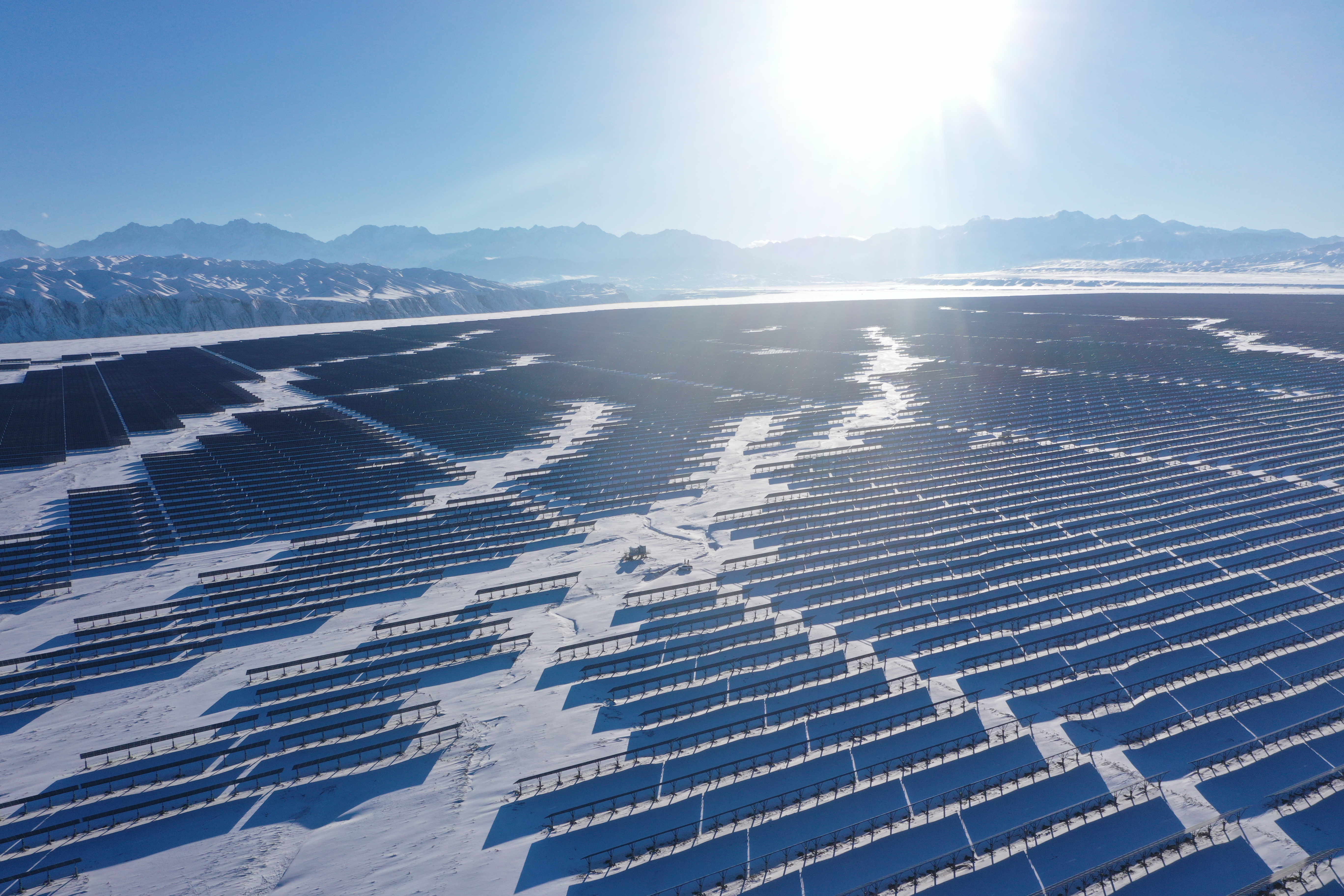 在遼闊而壯觀的戈壁沙漠之中,一片壯觀的水電藍(lán)如同黎明的第一縷光線般閃耀著耀眼的光芒,為新疆塔城地區(qū)鑲嵌上一條流動的星河,使其成為絲綢之路上璀璨奪目的明珠。極目遠(yuǎn)眺,廣袤草原宛如天然畫卷,一排排光伏方陣以千軍萬馬之勢整齊列陣,似守護邊疆的鋼鐵勁旅,綿延向天地交融之處。亮銀色與深藍(lán)色交織的光伏板,如千萬面明鏡輝映長空,在熾烈陽光的撫觸下,折射出刺破云霄的光芒,將現(xiàn)代科技的雄渾氣魄與塞外風(fēng)光的壯美蒼茫完美交融,繪就一幅震撼人心的能源新圖景。