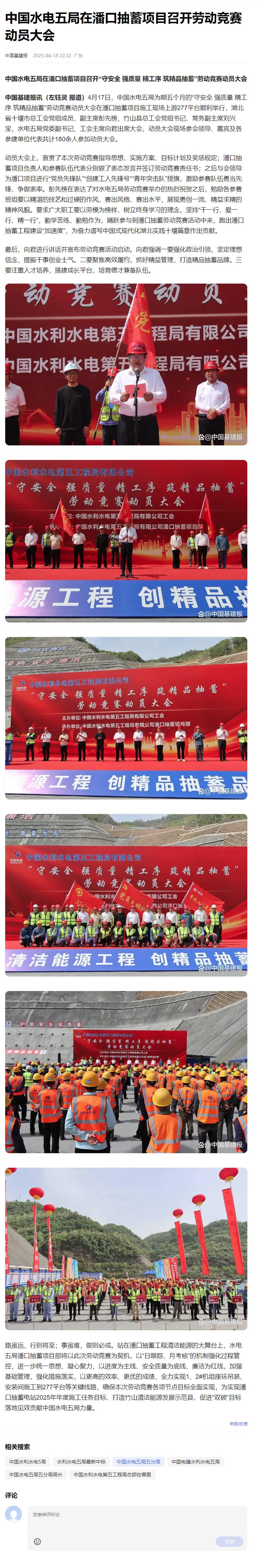 路雖遠(yuǎn),行則將至;事雖難,做則必成。站在潘口抽蓄工程清潔能源的大舞臺上,水電五局潘口抽蓄項目部將以此次勞動競賽為契機,以“日跟蹤、月考核”的機制強化過程管控,進一步統(tǒng)一思想、凝心聚力,以進度為主線、安全質(zhì)量為底線、廉潔為紅線,加強基礎(chǔ)管理,強化措施落實,以更高的效率、更優(yōu)的成績,全力實現(xiàn)1、2#機組座環(huán)吊裝、安裝間施工到277平臺等關(guān)鍵線路,確保本次勞動競賽各項節(jié)點目標(biāo)全面實現(xiàn),為實現(xiàn)潘口抽蓄電站2025年年度施工任務(wù)目標(biāo)、打造竹山清潔能源發(fā)展示范縣、促進“雙碳”目標(biāo)落地見效貢獻中國水電五局力量。