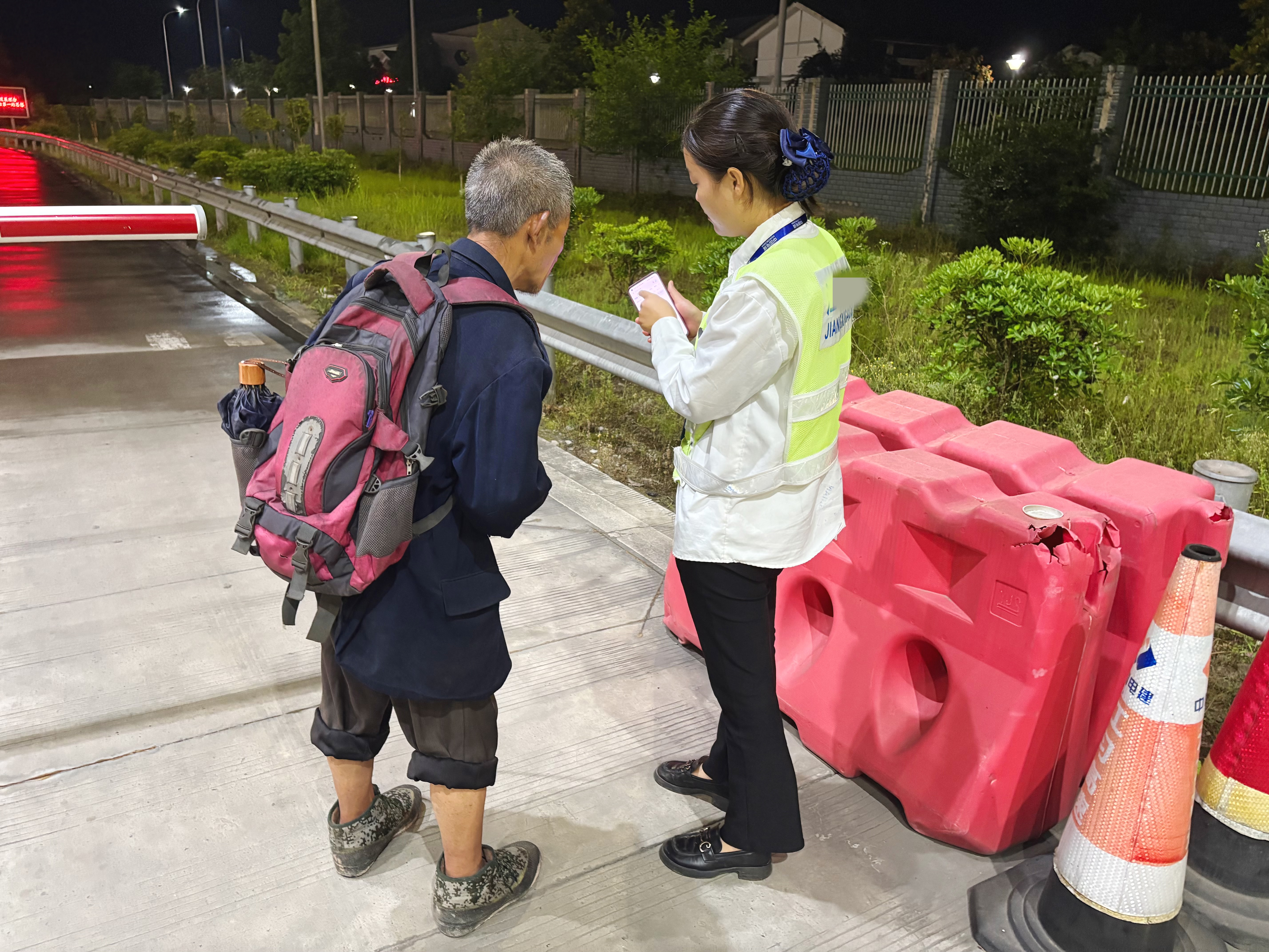 當(dāng)日凌晨5時(shí)10分,中山收費(fèi)站收費(fèi)員何葉在進(jìn)行夜間例行巡查時(shí),發(fā)現(xiàn)一位老人正沿著高速公路護(hù)欄冒雨前行。老人褲腿被雨水浸透,手中緊握戶籍本,步履蹣跚,情況危急。何葉見狀,立即撐傘上前,將老人攙扶至安全區(qū)域。
